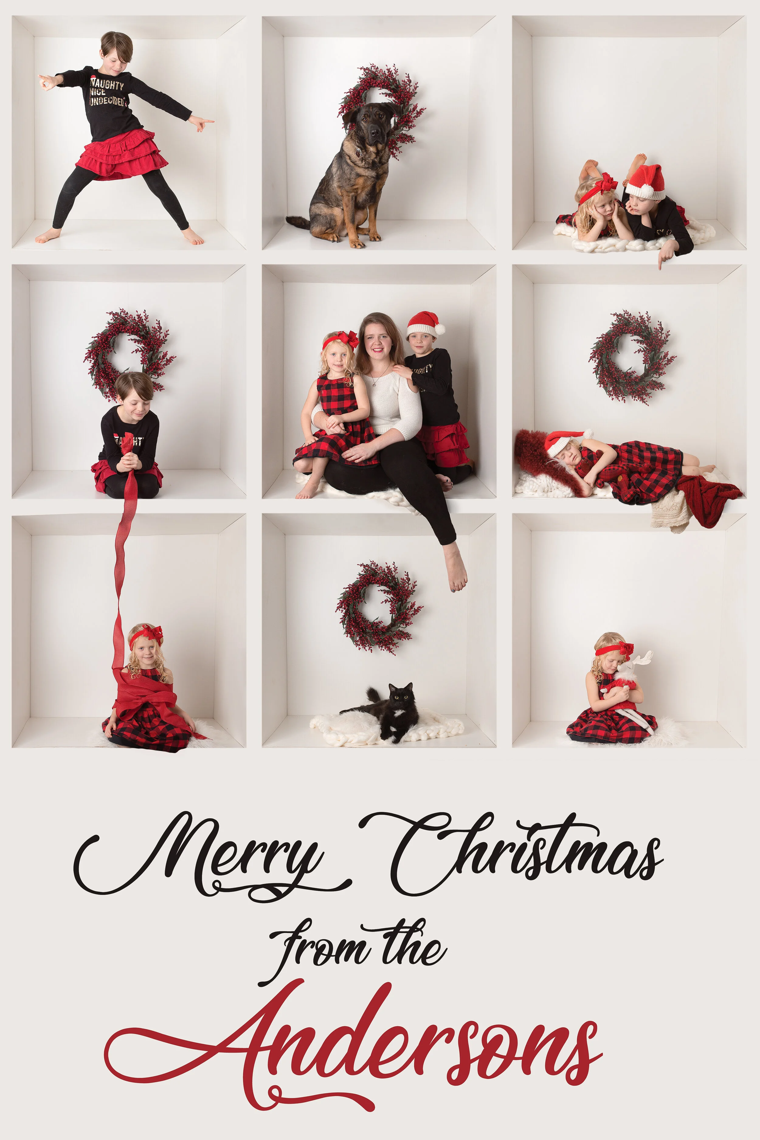 Each Session comes with a 9 image collage with a holiday message of your choosing on the front. Session last about 30 minutes and we’ll shoot about 20 poses. I’ll send you the gallery of lightly edited images and you can be part of the process of deciding which 9 images to use in your collage.